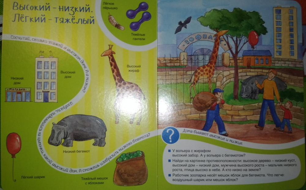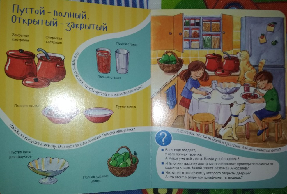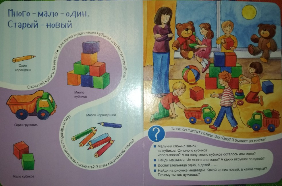Интересный формат книги. На первой странице разворота вводятся понятия, на второй странице закрепление понятий, работа с картинкой. Книга картонная, прочная.