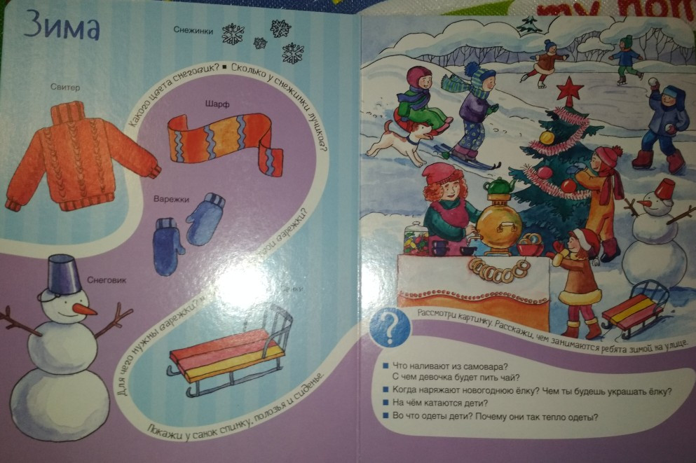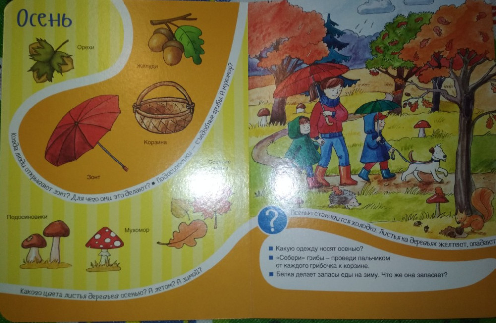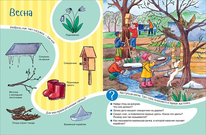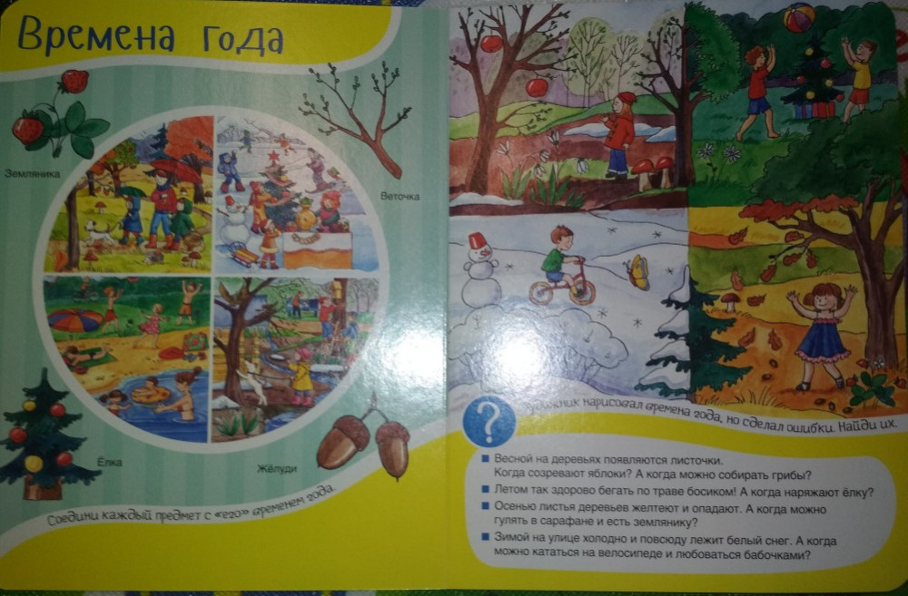 Интересный формат книги. На первой странице разворота вводятся понятия, на второй странице закрепление понятий, работа с картинкой. На последнем развороте закрепление всех времён года. Книга картонная, прочная.