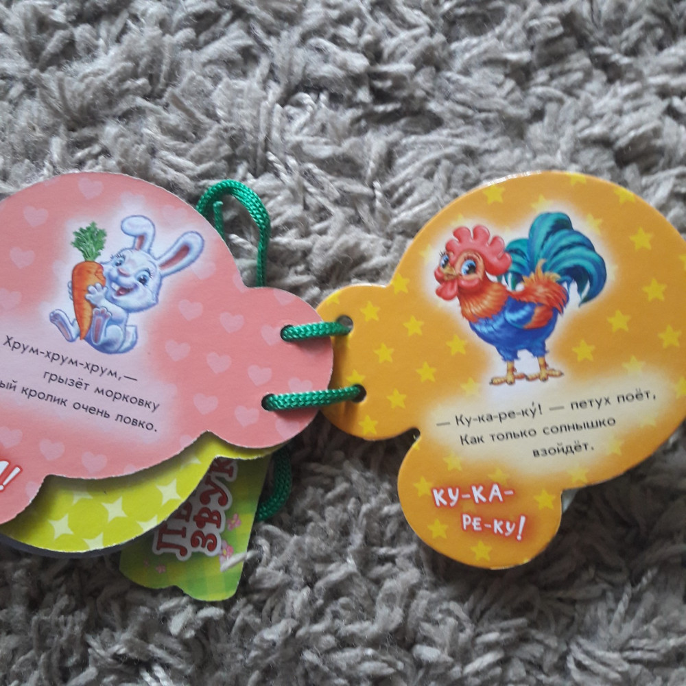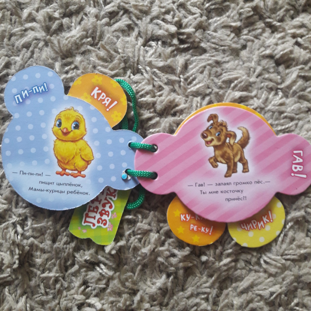 Замечательная серия книжек. Маленькие, красочные. Для каждого предмета и существа привязка звука (котёнок мяу, кораблик ту-ту) и к каждому небольшой стишок. На фото-превью книжка изображена скреплённой шнурком, в оригинале книжный переплёт.