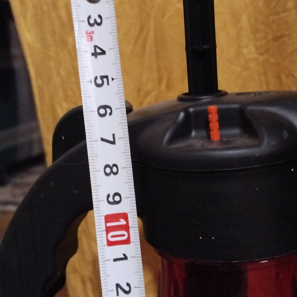 Грузик на шланчике не достаточно тяжёлый, когда переворачиваешь, плавает на поверхности, захватывает воздух. Воздух накачивает плохо. При высоте поршня 17см, накачивать начинает при 6см. Приходиться очень долго его накачивать.