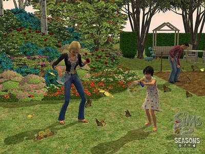 Наконец-то разработчики симсов поняли, чего так не хватало нам, игрокам, в первой версии! Конечно же, вечное лето кого угодно доведет до ручки и до точки. Теперь симы могут любоваться весенними грозами, снегопадами, листопадами и собирать коллекции жуков и бабочек. Можно построить теплицу и круглый год выращивать овощи и ягоды: есть самим или продавать. Кстати, если порыться в интернете, можно найти рецепты плодово-ягодных коктейлей, которые дают симу те или иные возможности: от усиления навыка до улучшения общего самочувствия. Само собой, в багаже появляется новый агрегат: соковыжималка. Фрукты можно выращивать на деревьях: яблоки, апельсины и лимоны. Само собой, за растениями придется ухаживать, иначе вырастет плод вялый и безвкусный. Чем дольше ухаживаешь, тем лучше это получается. Любителям рыбной ловли тоже не придется скучать: если у вас на участке есть пруд (его можно вырыть самостоятельно) - то весной, летом и осенью прекрасно ловится рыбка, большая и маленькая, которую можно сделать чучелом, повесить на стену, продать или приготовить. Зимой пруд замерзает. А если увлекаться обрызгиванием деревьев химикатами, можно превратиться в зеленого человечка-ростомана. Они не очень хорошенькие, зато для жизни им нужны только вода, солнце и ласка, а размножаются они почкованием. Если надоест - всего можно купить у знахарки снадобье и снова стать человеком.