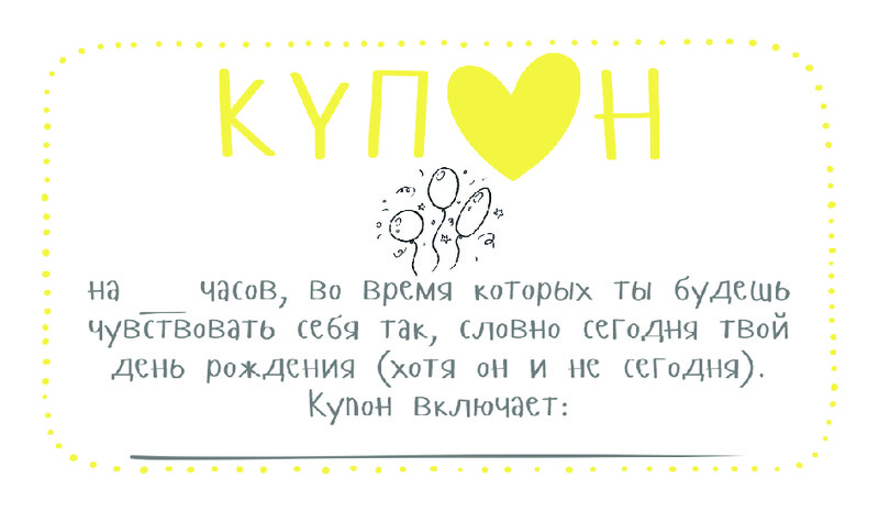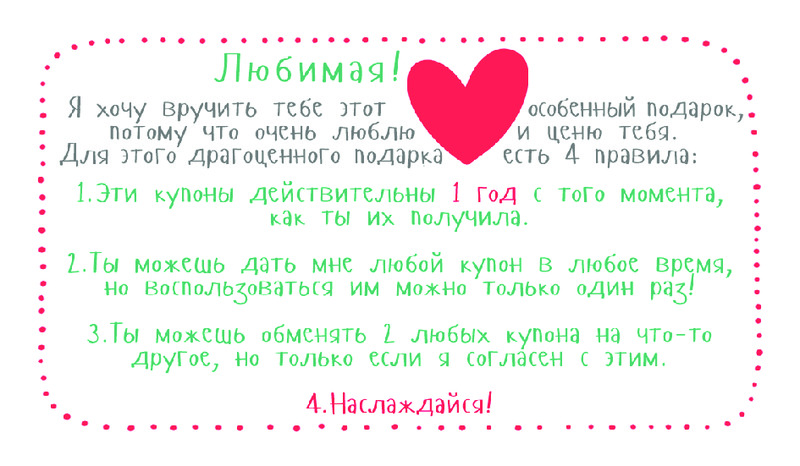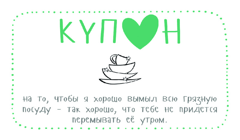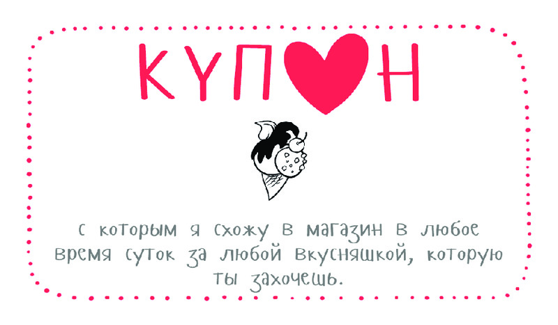 Серия: Дом. Быт. Досуг. Этот набор более чем из 30 купонов — прекрасный подарок для любимой. Купоны предлагают твоей девушке выполнить указанные в них действия, или же ты можешь загадать свои особенные желания именно для нее. Пусть эти веселые и приятные сюрпризы принесут много радости в ваши отношения! |