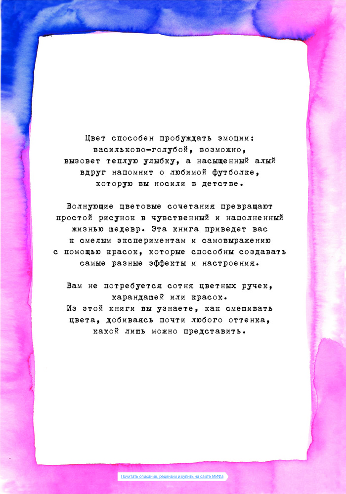 Когда солнце было кляксой. Книга вдохновляющего рисованияВ данный момент этот товар отсутствует в продаже. Возможно, у нас найдется аналогичный или похожий товар здесь. Серия: МИФ. Творчество Для каждого из нас какие-то цвета имеют особенное значение. Васильково-голубой оттенок может заставить тепло улыбнуться, а насыщенный алый вдруг напомнит о любимой футболке, которую вы носили в детстве. |