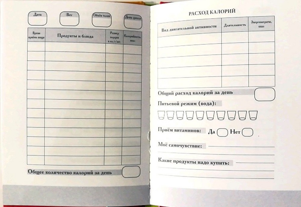 Ожидала, что будет больше, но на самом деле такой формат даже удобнее носить с собой (примерно 17*12*1,5см). На первой странице нужно писать свои объемы и вес и цель, на последней - то же самое, и достигнута ли цель :) очень должно мотивировать. Есть полезная информация в начале - таблицы калорийности разных продуктов, энергозатраты при различных видах физ.активности, и дальше - линовка как на фото в описании к товару. Переплет кажется крепкий, прочный.