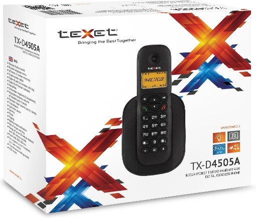 Модель TX-D4505A – телефон бюджетной категории со всеми необходимыми функциями: русифицированное меню, записная книжка на 20 имен, оранжевая подсветка дисплея, русский АОН с памятью 10 номеров. Очень ладный и нарядный дизайн. Удобное расположение кнопок. Простое и понятное меню. Четкий и яркий шрифт.