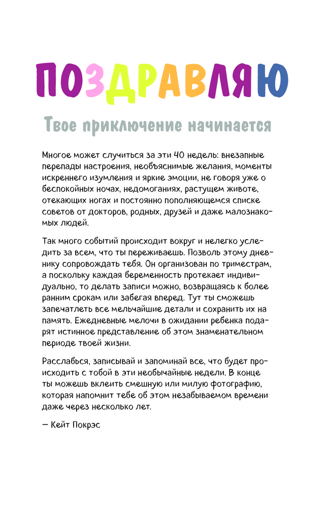40 недель. Дневник моей беременностиВ данный момент этот товар отсутствует в продаже. Возможно, у нас найдется аналогичный или похожий товар здесь. Серия: Подарочные издания. Ребенок За 40 недель может случиться многое: внезапные перепады настроения, необъяснимые желания, моменты искреннего изумления и яркие эмоции, не говоря уже о беспокойных ночах, растущем животе и постоянно пополняющемся списке советов от докторов, родных, друзей и даже малознакомых людей. Событий вокруг так много, и нелегко уследить за всем, что ты переживаешь. Этот иллюстрированный дневник создан для того, чтобы ты могла зафиксировать в нем все, что будет происходить в эти необычайные недели, вклеить смешные фотографии и посмеяться над разными забавными ситуациями во время беременности. |