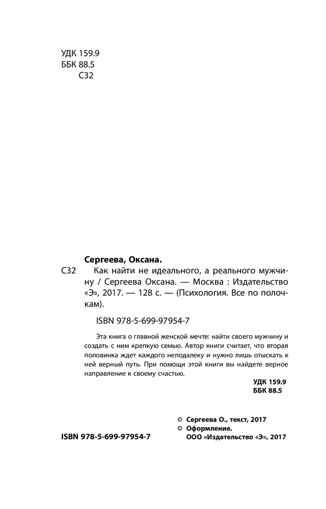 Как найти не идеального, а реального мужчинуВ данный момент этот товар отсутствует в продаже. Возможно, у нас найдется аналогичный или похожий товар здесь. Серия: Психология. Все по полочкам. Новое оформление Эта книга о главной женской мечте: найти своего мужчину и создать с ним крепкую семью. Автор книги считает, что вторая половинка ждет каждого неподалеку и нужно лишь отыскать к ней верный путь. При помощи этой книги вы найдете верное направление к своему счастью. |