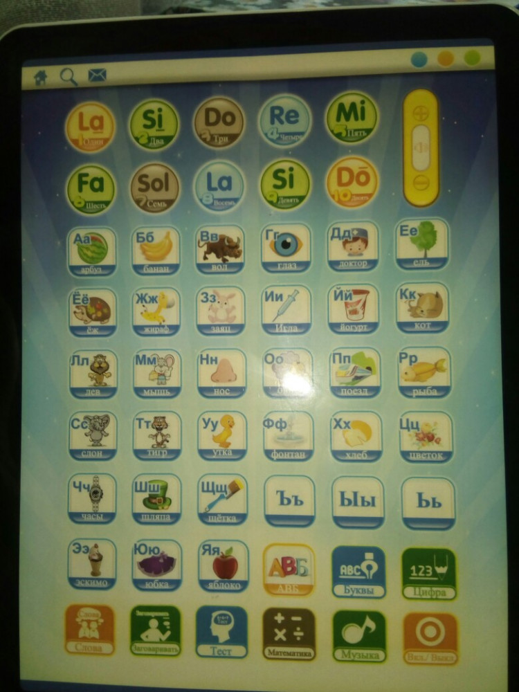 Kribly Boo Интерактивная игрушка «Обучающий планшет» (7 режимов)В данный момент этот товар отсутствует в продаже. Возможно, у нас найдется аналогичный или похожий товар здесь. Обучающий интерактивный планшет поможет в игровой форме выучить буквы, цифры, целые слова и даже ноты, а также развить память, внимание и способность к восприятию. Кнопки ярко оформлены, их удобно нажимать детскими пальцами, уровень громкости звука регулируется. |