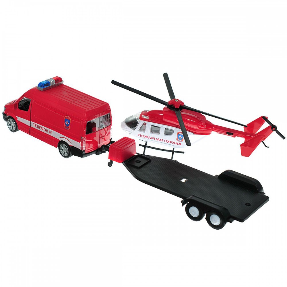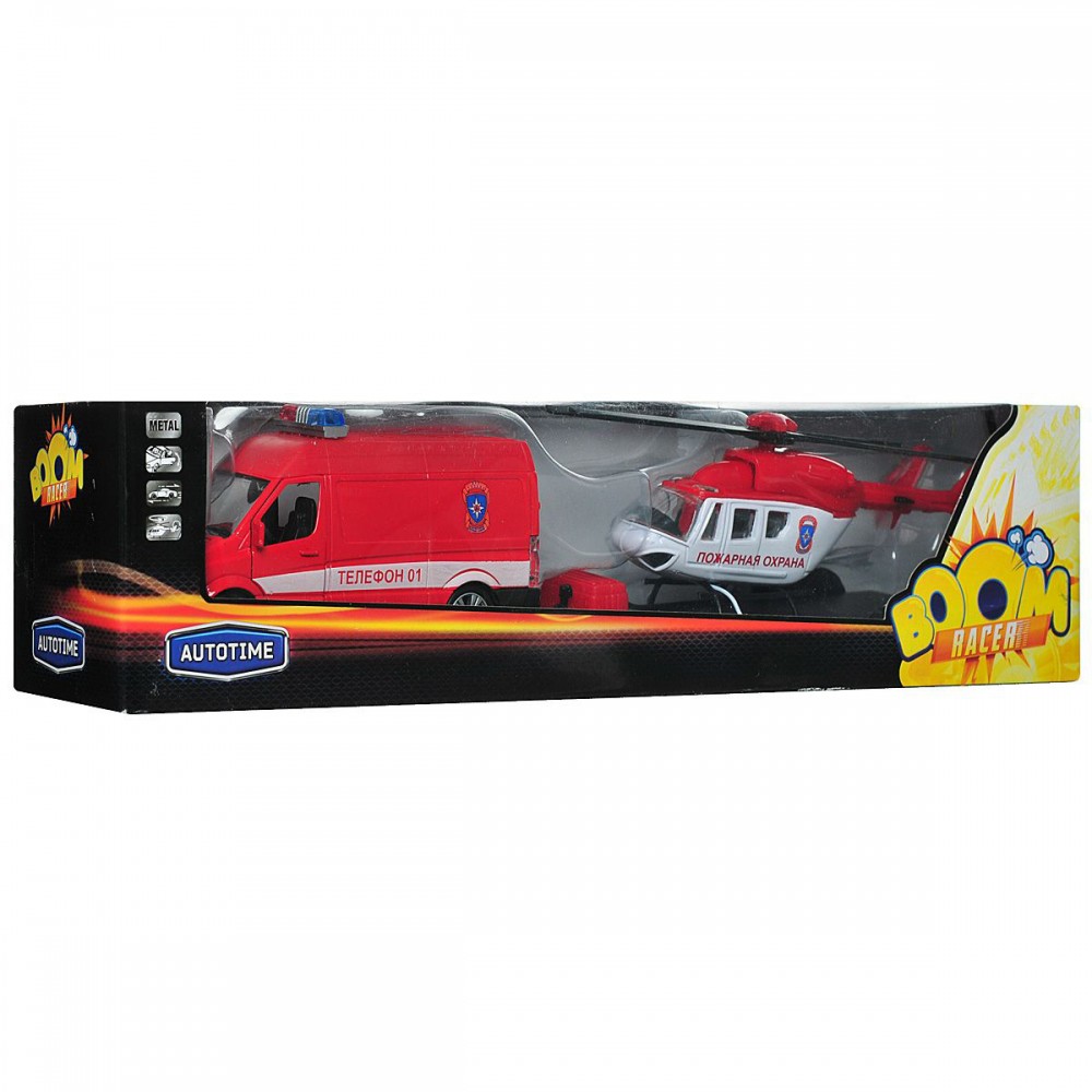 Autotime Инерционная машина Пожарная охрана с вертолетомВ данный момент этот товар отсутствует в продаже. Возможно, у нас найдется аналогичный или похожий товар здесь. Компания Autotime разработала игрушечный набор, который состоит из микроавтобуса с прицепом и вертолетом. Корпуса машины и вертолета выполнены из металла и раскрашены красным и белым цветами. Внутренние части и прицеп состоят из пластмассы. Микроавтобус имеет инерционный механизм, который заведется, если, надавив немного на машинку, откатить ее назад и отпустить. |