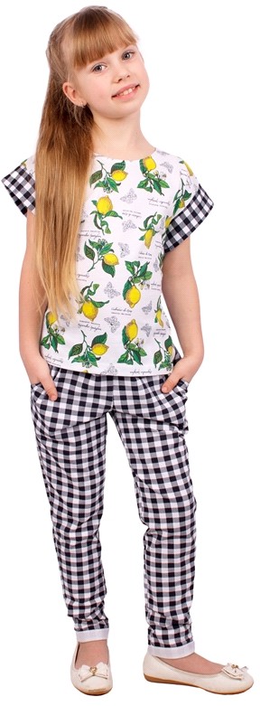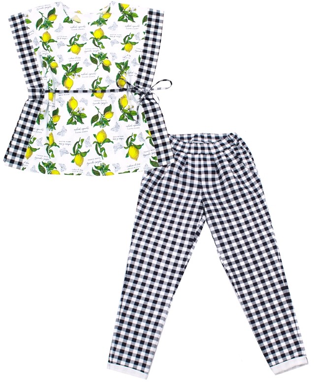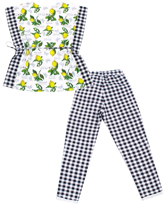 Комплект для девочек "Лимонное лето" мне не понравился вверх костюма, так как сшито из тонкого материала, качество желает лучшего, а вот брючки очень хорошо сшиты, и с качественного, плотного материала, мне больше понравились брюки, чем топик! Рекомендую покупать только брюки!