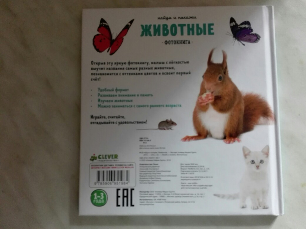 Перед Новым годом брал эту книгу в подарок внуку. Теперь взял его двоюродному братику. Книжка им очень нравится. Как раз для развития восприятия малышам возраста от одного до трех годиков. Качество книжки 5 баллов из 5. Твердый переплёт. Глянцевые страницы. Чёткие и реальные фотки.