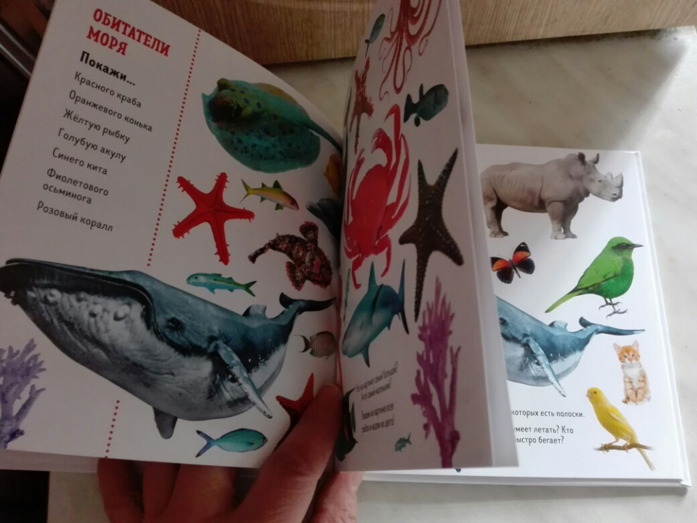 Книга не понравилась. Потому что есть иллюстрация животных но нет названия. Согласитесь как то не удобно сидеть и искать как зовут ту или иную рыбу. Ребенку 4-5 лет не объяснить что названия нет в книге. Итог: за свои же денежке нашла себе доп работу по поиску названий животных.