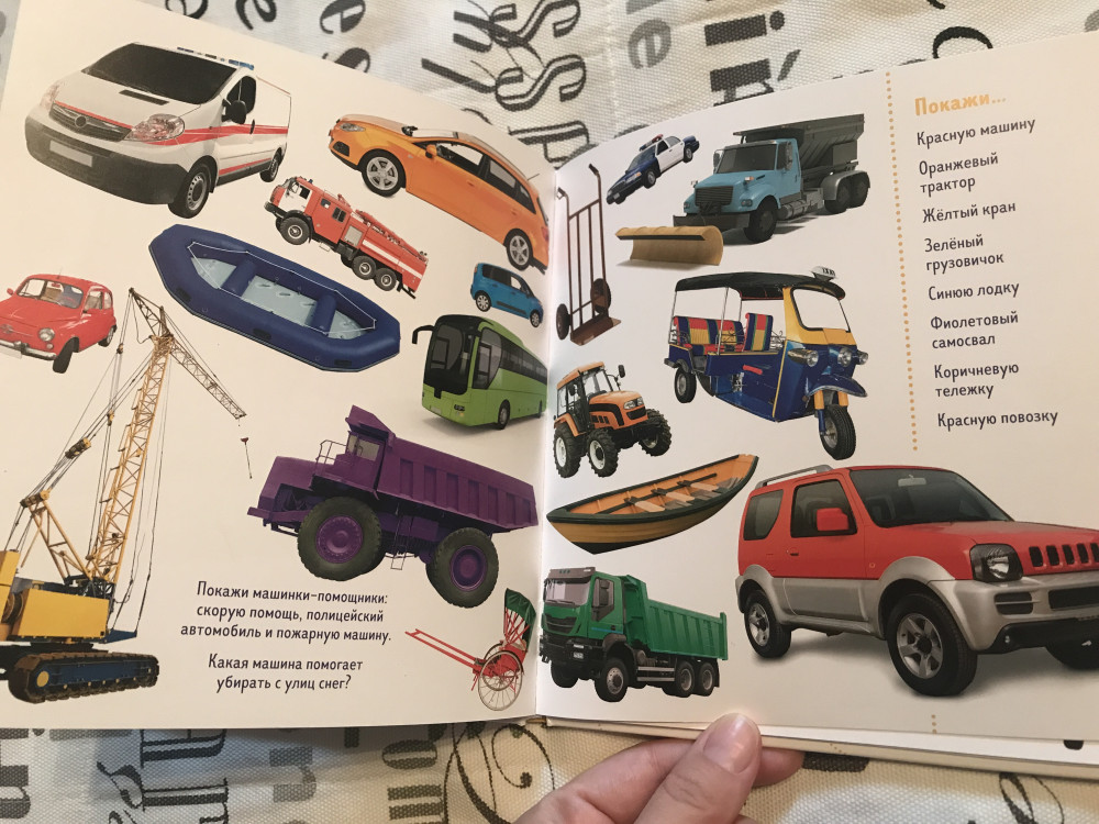 Книжка очень интересная и занимательная. Ребенок с удовольствием рассматривает яркие картинки различного транспорта, быстро находит ответ на заданные вопросы по книге. Очень понравилась, советую купить, если есть дома мальчики от 3-лет, развивает внимательность и расширяет кругозор.