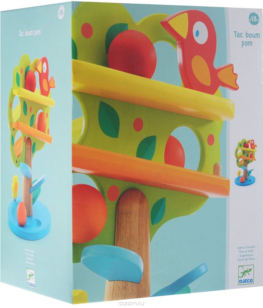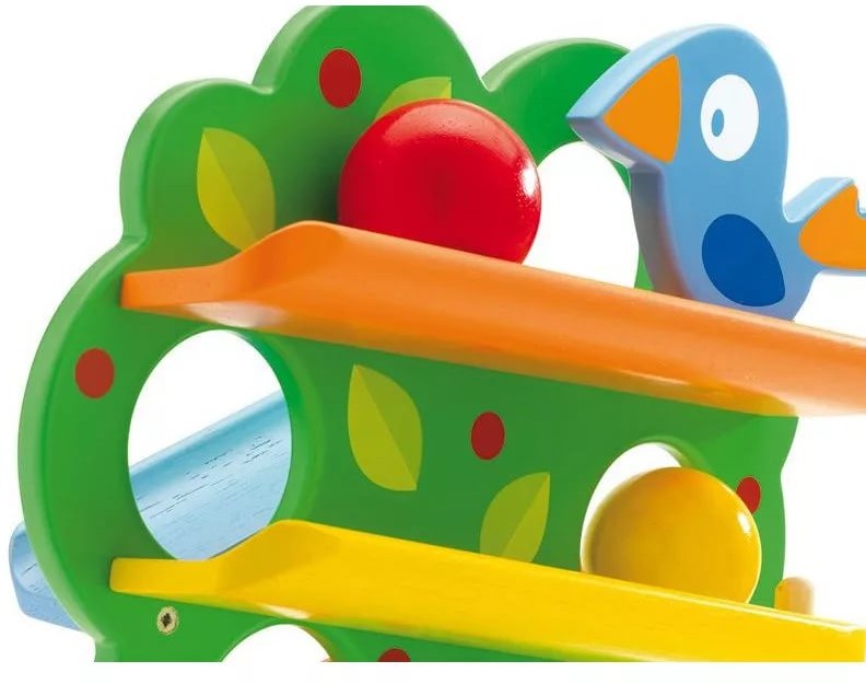 Игрушка представляет собой красочное дерево с желобами и разноцветными яблочками-шариками. Если положить яблочко сверху, то оно начнет скатываться вниз по желобам, через отверстия к стволу дерева. Ребенок каждый раз будет с удовольствием наблюдать, куда на этот раз упадет яблочко.