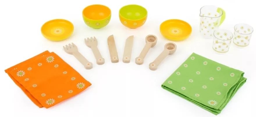 Все детали, кроме кувшина со стаканами, изготовлены из дерева приятного на ощупь. Кувшин и стаканы изготовлены из высококачественного прочного пластика. Все детали соответствуют необходимым стандартам качества, имеют обтекаемую форму, что приятно ручкам малыша и безопасно для игр детей.