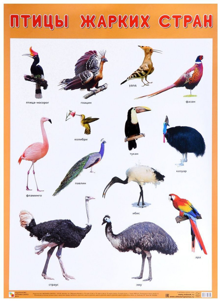 💳 Оплатить за товар можно при получении 🇰🇿 Есть бесплатная доставка по Казахстану от 1 дня 🎁 Копите бонусы с каждой покупки Серия: Плакаты большого формата Плакат большого формата «Птицы жарких стран» познакомит детей с экзотическими птицами, поражающими красотой своего оперения и удивляющими разнообразием внешнего облика. Четкие, яркие фотографии обязательно заинтересуют ребят и помогут усвоить новые знания. Наглядный материал может быть использован на занятиях по ознакомлению с окружающим миром, для развития речи и мышления. |