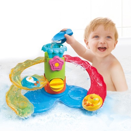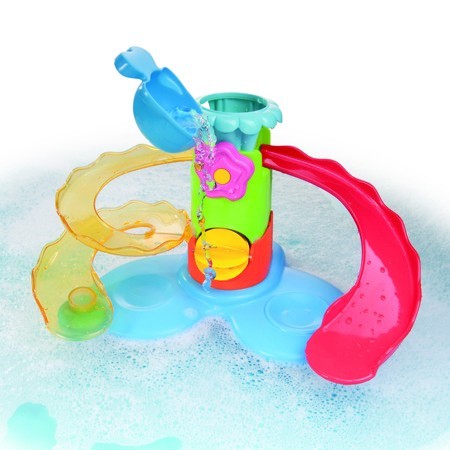Набор содержит спиралевидную двухуровневую горку, фигурки бегемотика, моржа и осьминога. Крепления для горки не нужны, она плавает на поверхности воды. Налейте воду, поверните звездочку и фигурки весело покатятся вниз, кружась под звонкие брызги. Если повернуть звездочку влево - фигурки покатятся по левой части горки, а если вправо, то по правой. В своих лодочках бегемотик с моржом будут плавать в ванной вместе с вашим малышом.Под струей воды закрутится и водяная мельница.Осьминога можно закрепить на самый верх горки или использовать как ковш.