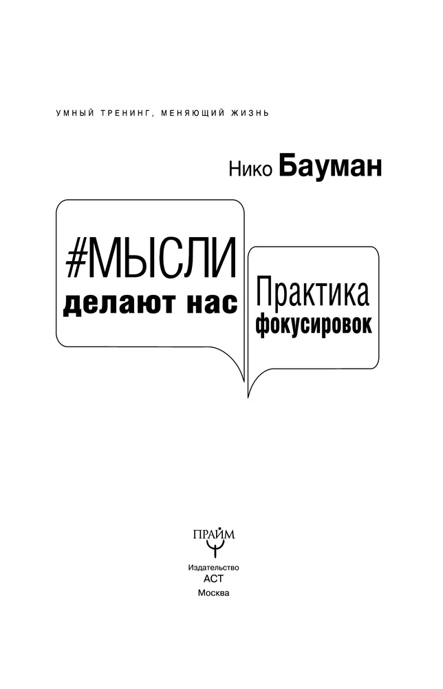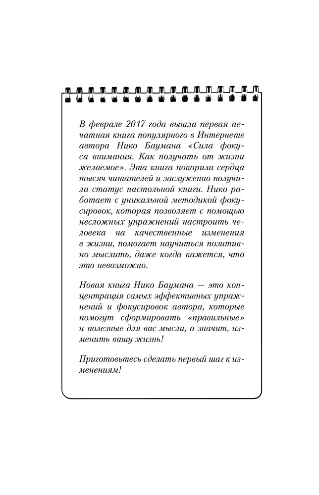 #Мысли делают нас. Практика фокусировокВ данный момент этот товар отсутствует в продаже. Возможно, у нас найдется аналогичный или похожий товар здесь. Серия: Умный тренинг, меняющий жизнь К вам в руки попала необычная книга... Это факт! И вы в этом убедитесь! Нико Бауман — загадочный тренер, который учит управлять событиями жизни при помощи мыслей. Он обучил уже сотни тысяч человек искусству эффективного использования «психической кнопки» внимания.Новая книга Нико Баумана — это прорыв в глубины сознания, это возможность настроить свой ум таким образом, чтобы чувствовать себя хорошо во всех отношениях. Ведь от правильного самонастроя зависит очень многое в жизни. |