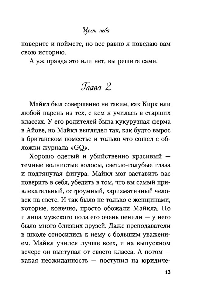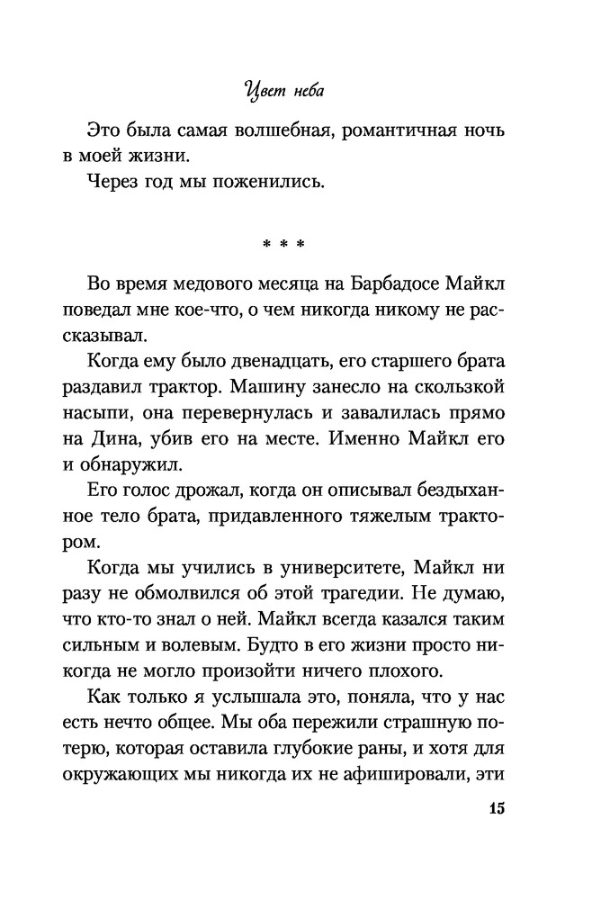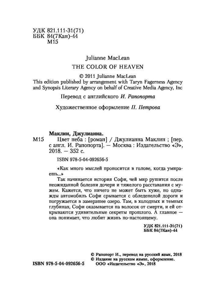 Цвет небаВ данный момент этот товар отсутствует в продаже. Возможно, у нас найдется аналогичный или похожий товар здесь. Серия: Бест прайс. Современная зарубежная проза (обложка) «Как много мыслей проносится в голове, когда умираешь...» Так начинается история Софи, чей мир рушится после неожиданной болезни дочери и тяжелого расставания с мужем. Кажется, что ничего не может быть хуже, но однажды автомобиль Софи срывается с обледенелой дороги и погружается в замерзшее озеро. Там, в холодных и темных глубинах, Софи оказывается на волоске от смерти, и ей открываются удивительные секреты прошлого. А главное — она понимает, что любит жизнь по-настоящему. |