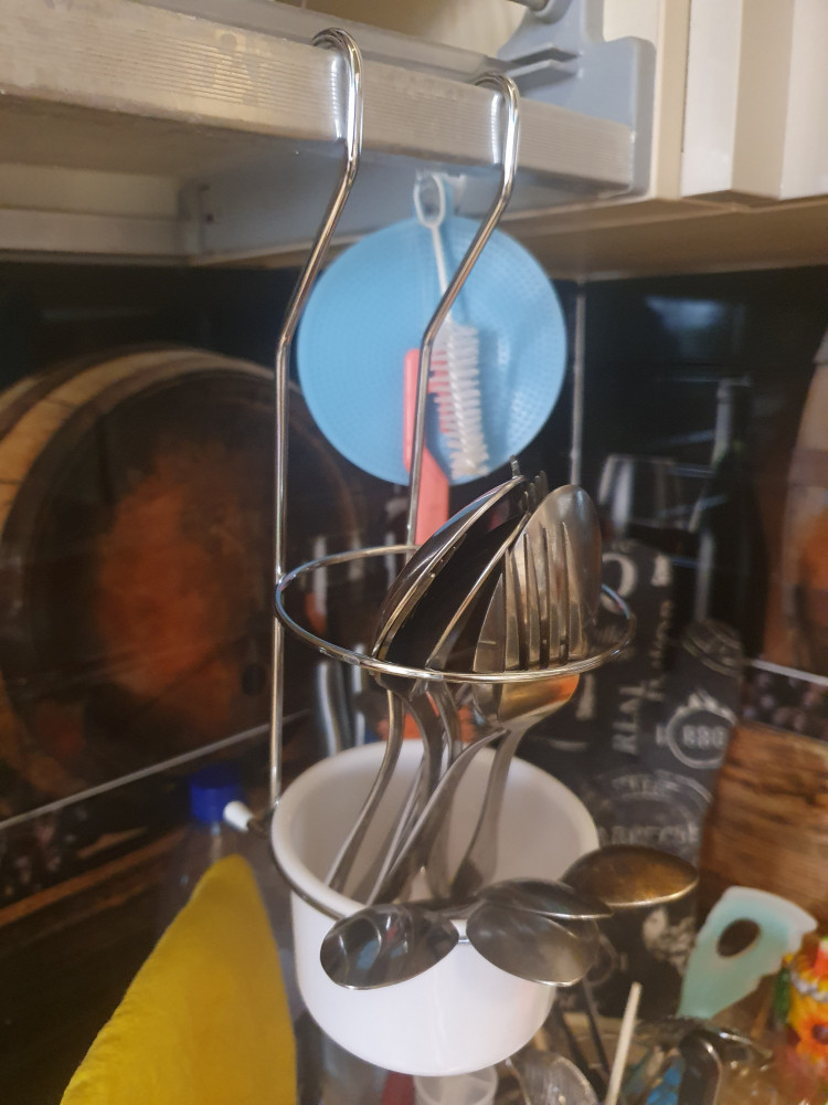 Нам подставка как раз подошла, повесили, так как в стоячем состоянии нам стаканчик маловат под приборы. В целом покупкой довольна, пластиковый стаканчик хорошего качества