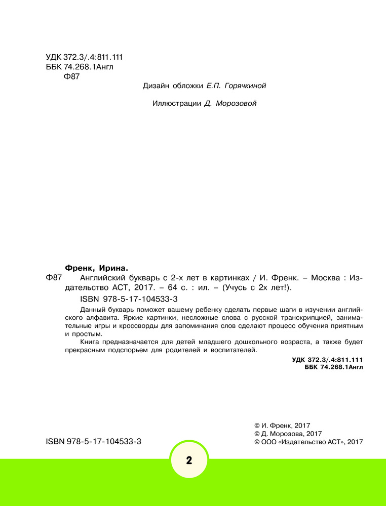 💳 Оплатить за товар можно при получении 🇰🇿 Есть бесплатная доставка по Казахстану 🎁 Копите бонусы с каждой покупки Серия: Учусь с 2х лет! Данный букварь поможет вашему ребенку сделать первые шаги в изучении английского алфавита. Яркие картинки, несложные слова с русской транскрипцией, занимательные игры и кроссворды для запоминания слов сделают процесс обучения приятным и простым. Книга предназначается для детей младшего дошкольного возраста, а также будет прекрасным подспорьем для родителей и воспитателей. |