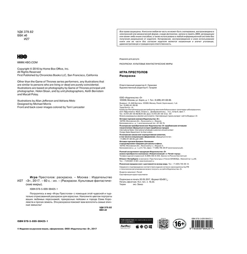 Игра Престолов. РаскраскаВ данный момент этот товар отсутствует в продаже. Возможно, у нас найдется аналогичный или похожий товар здесь. Серия: Раскраски. Культовые фантастические миры Погрузитесь в мир «Игры Престолов» с помощью этой чудесной и тщательно отрисованной раскраски для взрослых. Наполните цветом портреты ваших любимых персонажей, прекрасные пейзажи и города Семи Королевств и прочих земель. Эта раскраска поможет вам воплотить самые эпичные замыслы! |