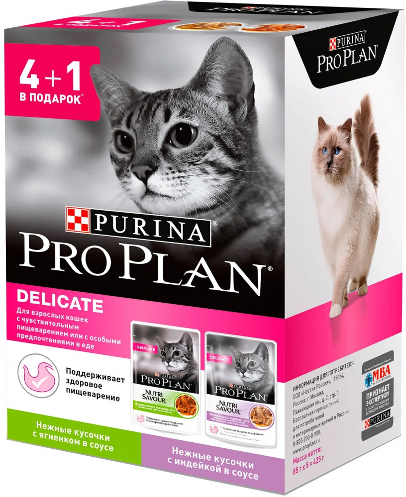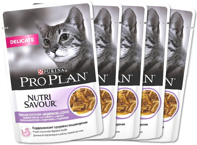| Purina Корм для кошек с чувствительным пищеварением «Pro Plan», с индейкой (комплект из четырёх паучей + один в подарок)