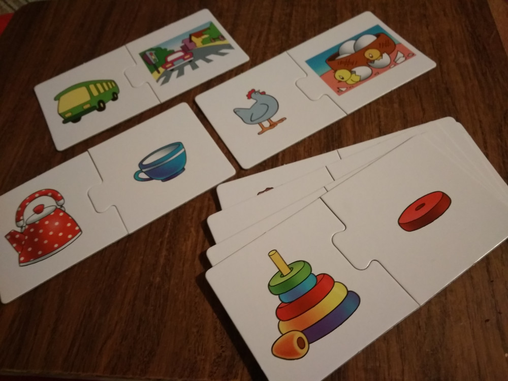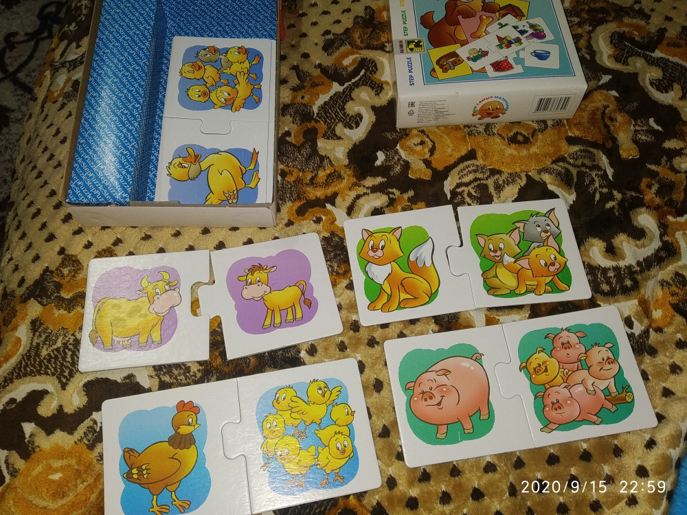 Товар Получила. Спасибо. Заказывала комплект. И того получила по две одинаковых. (Цвета и чей малыш ). Не было в комплекте "ассоциации"и "где чей домик", придётся заказывать отдельно. Ребенку игры понравились.