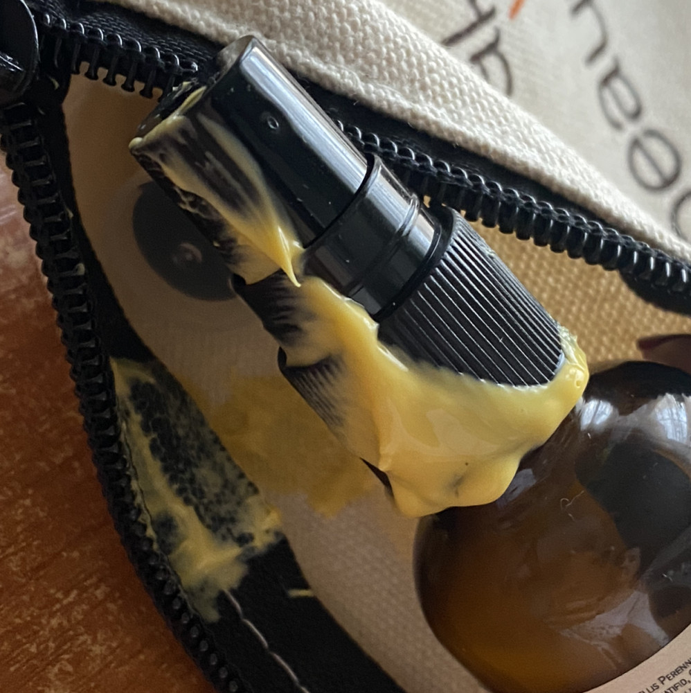Хочу дополнить свой отзыв от 26.01.2020. Вот так себя «повёл» крем без крышки при транспортировке в чемодане. Мико поменял немного размер флаконов (крышки стали меньше) у меня были крышечки от старых кремов мико, но они оказались велики к этому флакону крема. Поэтому, даже упаковав его аккуратно, чтобы не было давления на него другими вещами в чемодане, произошёл вот такой инцидент.
