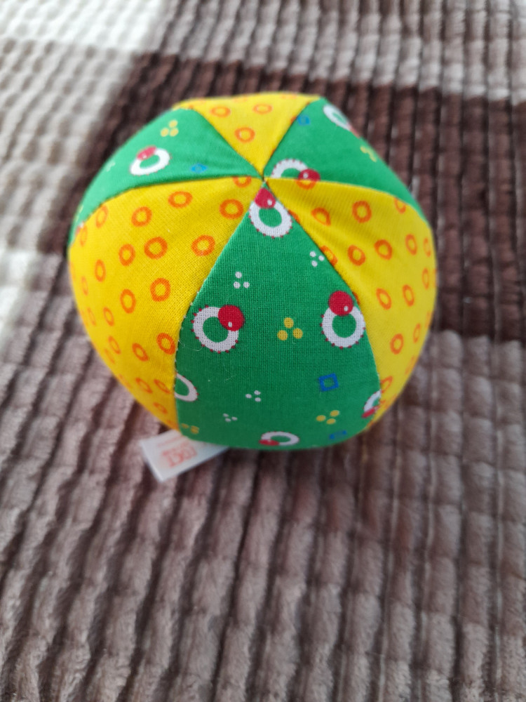 Игрушка мяч с погремушкой совсем не с погремушкой. Простой тряпичный мяч и никакого звука. Моя оценка 4.