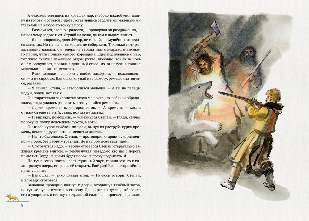 Остров мужестваВ данный момент этот товар отсутствует в продаже. Возможно, у нас найдется аналогичный или похожий товар здесь. Повесть «Остров мужества» рассказывает о истории из жизни четырех поморов, оказавшихся на острове Шпицбергене. Смелые русские промысловики — поморы с севера русской земли, уже несколько сотен лет назад, не боясь опасностей, уходили в море ловить рыбу, бить тюленей, моржей. Иногда добирались они и до дикого заполярного острова Шпицбергена. Поморы называли его Грумант. Там в то время водились во множестве моржи и тюлени. Поморы уходили на больших лодках — карбасах, с вёслами и парусом из оленьей кожи. Трудна и опасна была их жизнь. В 1797 году, около 200 лет назад, вышел в море на охоту за морским зверем такой карбас. Кормчим на нём был опытный моряк Алексей Химков. Взял он с собой, в первый раз, сына-подростка Ванюшку. Случилось так, что их карбас захватила осенняя поздняя буря и занесла к самому Шпицбергену. Шесть долгих лет они выживали на острове, пока их не обнаружили и не спасли моряки, случайно оказавшегося в тех краях корабля. Об их трудной жизни, опасных и удивительных приключениях рассказано в этой повести. |