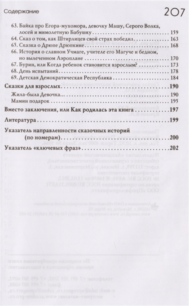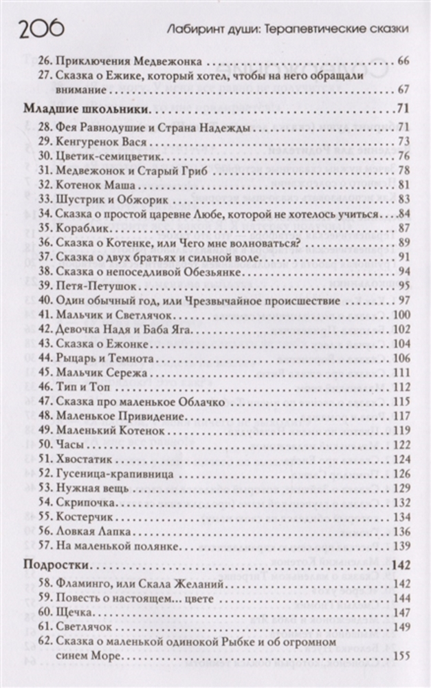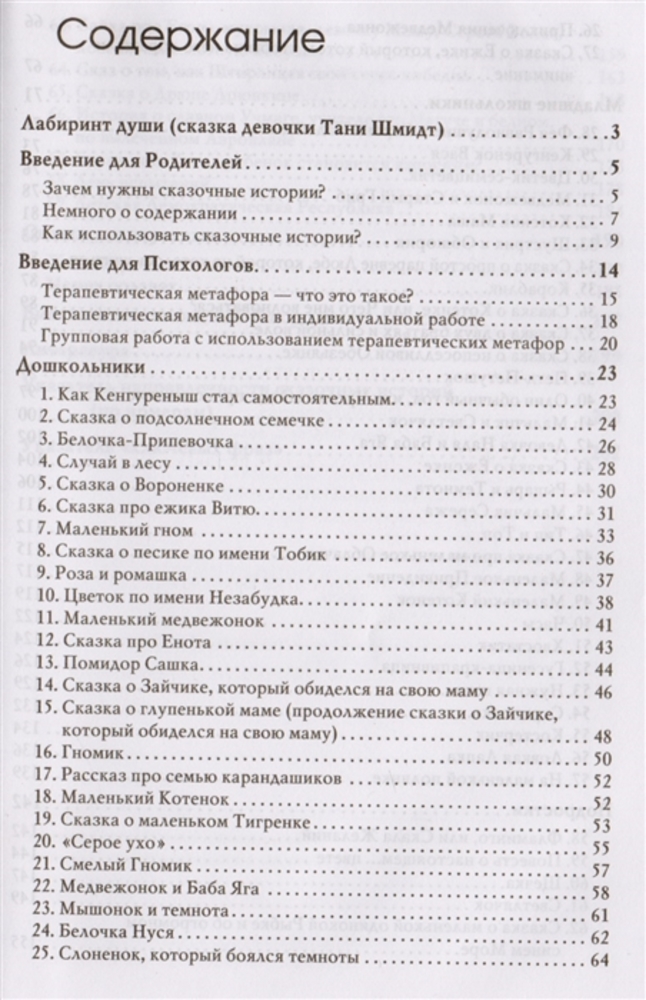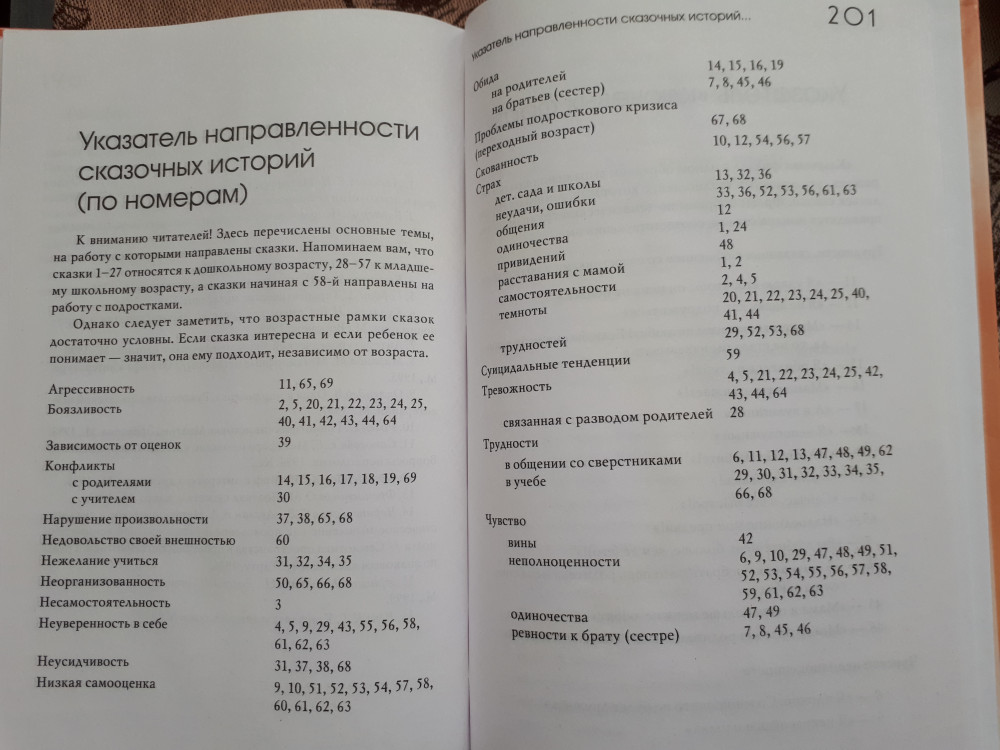 Сказки разделены по возрастам и по тематике. Если необходимо с ребенком проработать определенное чувство, перед каждой сказкой пишется тема проработки. В начале книги дается подробная инструкция, как с этой книгой работать. После каждой сказки идет список вопросов для обсуждения с ребенком. Книга шикарная!