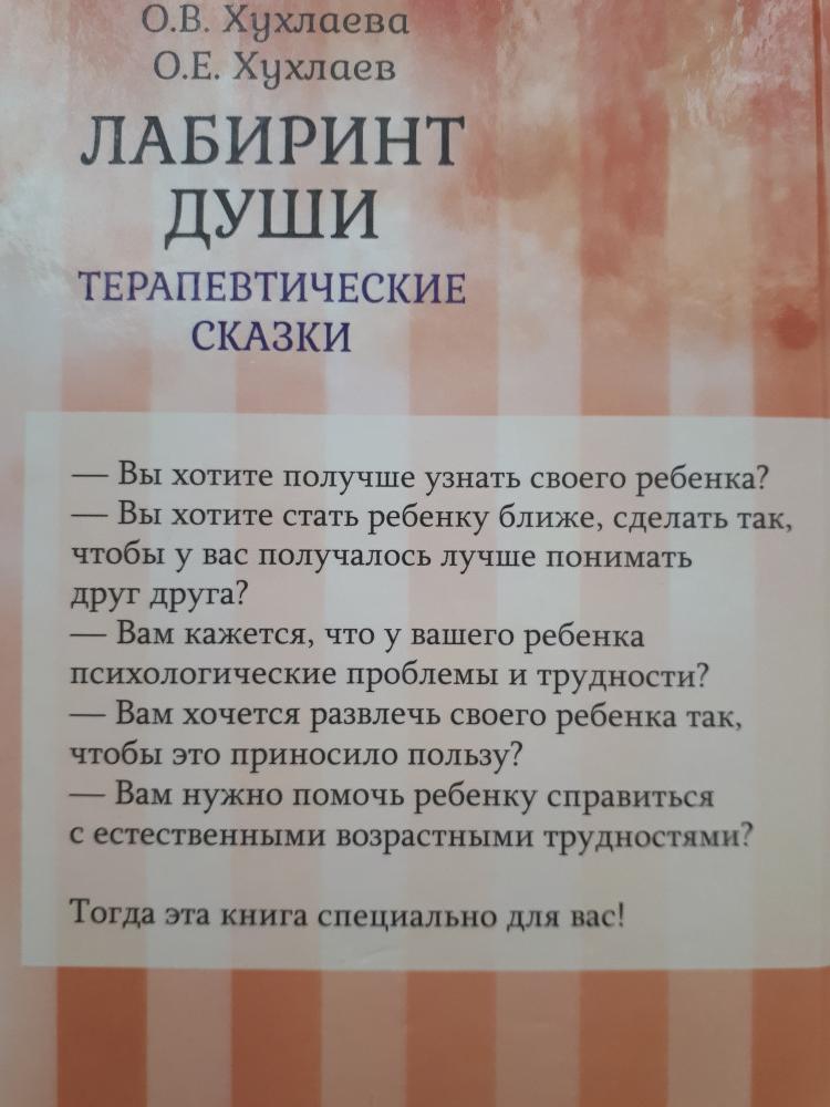 Лабиринт души. Терапевтические сказкиО. В. Хухлаева, Олег Евгеньевич Хухлаев В данный момент этот товар отсутствует в продаже. Возможно, у нас найдется аналогичный или похожий товар здесь. Серия: Психологические технологии. Сказкотерапия В книге представлены терапевтические сказки, предназначенные для психологической помощи детям от 3 до 15 лет. Терапевтические сказочные истории, написанные специально для детей и ориентированные на конкретные проблемы, — это разговор с ребенком о психологических трудностях на его собственном языке. Такие истории помогают детям находить выход из сложных ситуаций, выдерживать любые удары судьбы; с их помощью взрослый может лучше понять ребенка, стать ему ближе. Книга будет полезна как для психологов, учителей и воспитателей, так и для родителей. |