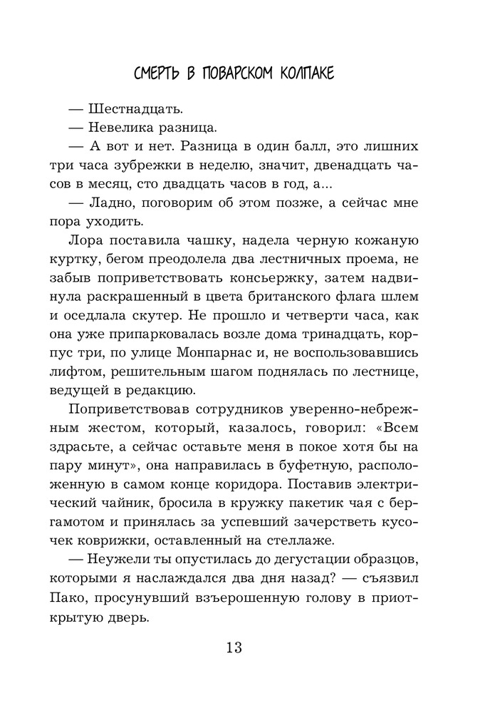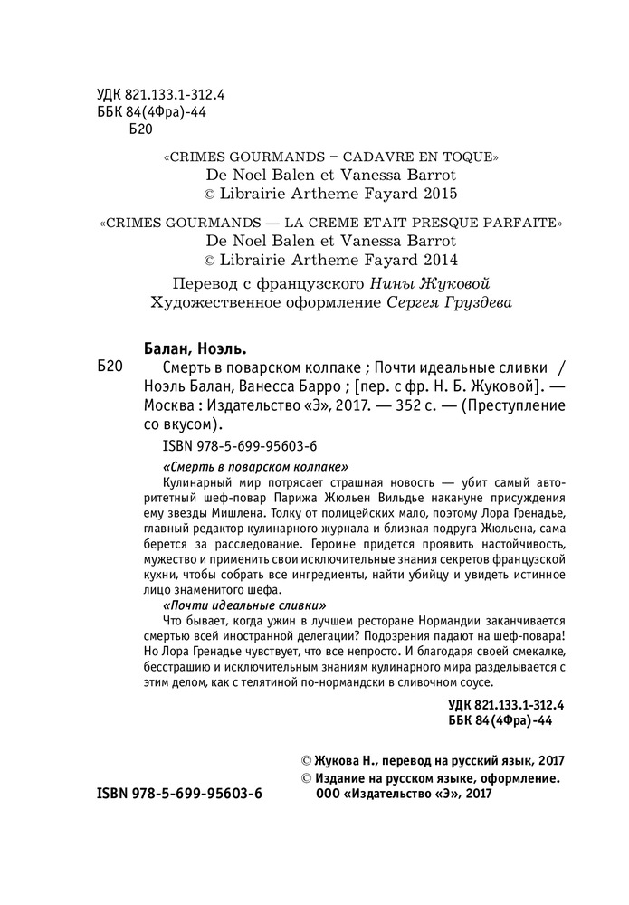 Смерть в поварском колпаке. Почти идеальные сливкиВ данный момент этот товар отсутствует в продаже. Возможно, у нас найдется аналогичный или похожий товар здесь. Серия: Преступление со вкусом "Смерть в поварском колпаке"Кулинарный мир потрясает страшная новость — убит самый авторитетный шеф-повар Парижа Жюльен Вильдье накануне присуждения ему звезды Мишлена. Толку от полицейских мало, поэтому Лора Гренадье, главный редактор кулинарного журнала и близкая подруга Жюльена, сама берется за расследование. Героине придется проявить настойчивость, мужество и применить свои исключительные знания секретов французской кухни, чтобы собрать все ингредиенты, найти убийцу и увидеть истинное лицо знаменитого шефа."Почти идеальные сливки"Что бывает, когда ужин в лучшем ресторане Нормандии заканчивается смертью всей иностранной делегации? Подозрения падают на шеф-повара! Но Лора Гренадье чувствует, что все непросто. И благодаря своей смекалке, бесстрашию и исключительным знаниям кулинарного мира разделывается с этим делом, как с телятиной по-нормандски в сливочном соусе. |