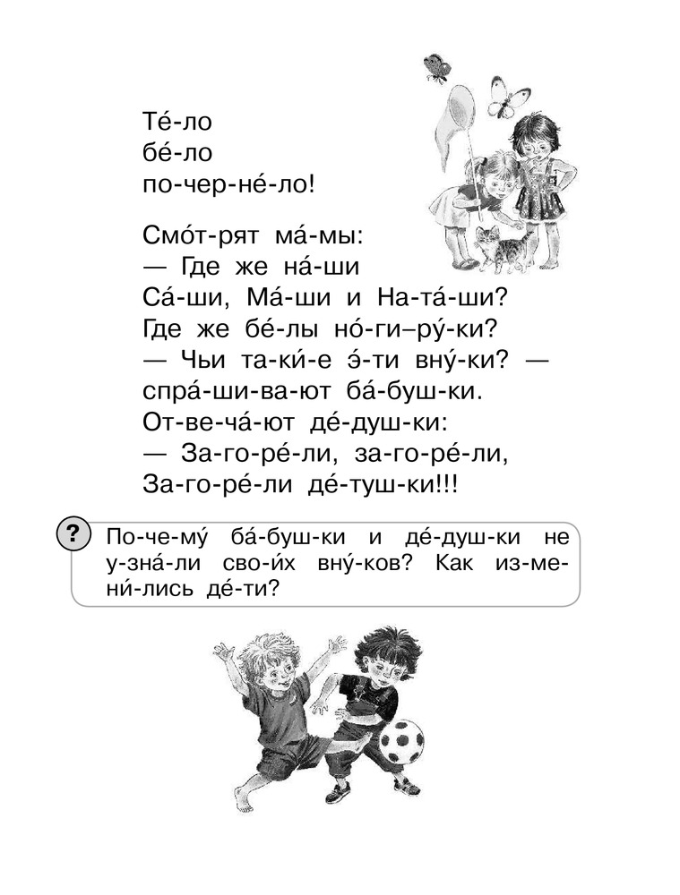 Крупный шрифт, черно-белые картинки. Тексты сначала идут с делением слов по слогам, затем постепенно переход к обычным. Прекрасный подбор стихов и текстов. Советую.