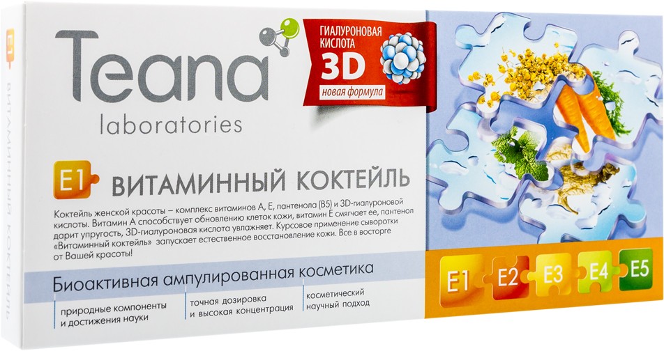 Teana Сыворотка для лица «E1 Витаминный коктейль»В данный момент этот товар отсутствует в продаже. Возможно, у нас найдется аналогичный или похожий товар здесь. Серия: Биоактивная ампулированная косметика Коктейль женской красоты — комплекс витаминов А, Е, пантенола (B5) и 3D гиалуроновой кислоты. Витамин А способствует обновлению клеток кожи, витамин Е смягчает ее, пантенол дарит упругость, 3D гиалуроновая кислота увлажняет. Курсовое применение сыворотки «Витаминный коктейль» запускает естественное восстановление кожи. Все в восторге от Вашей красоты! Изменение цвета и выпадение естественного осадка является нормой для натурального продукта. Сыворотка на водной основе. |