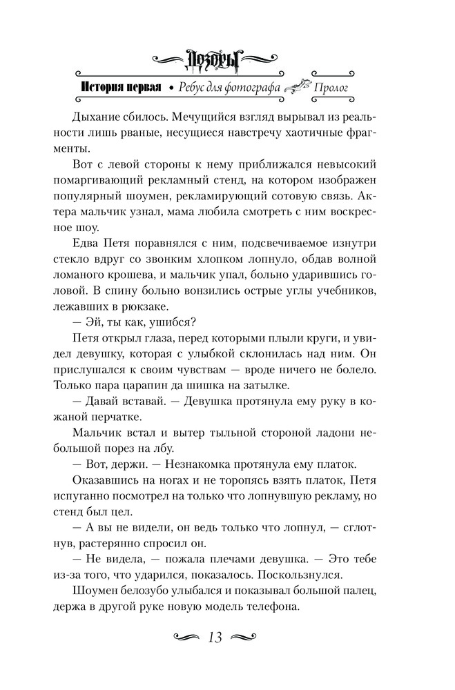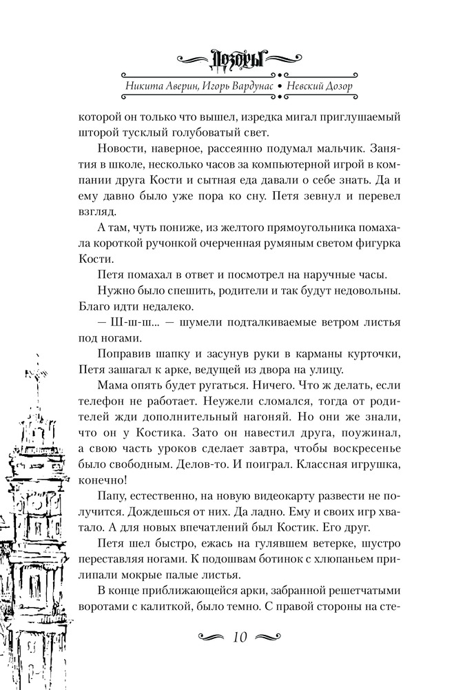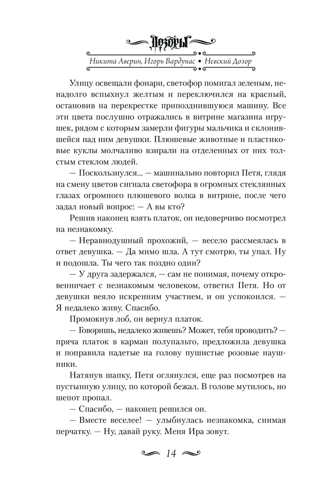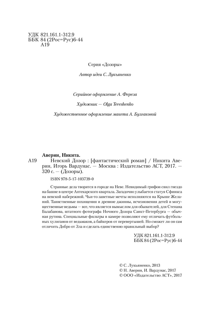 Невский ДозорНикита Владимирович Аверин, Игорь Владимирович Вардунас В данный момент этот товар отсутствует в продаже. Возможно, у нас найдется аналогичный или похожий товар здесь. Серия: Дозоры Странные дела творятся в городе на Неве. Невидимый грифон свил гнездо на башне в центре Аптекарского квартала. Загадочно улыбается статуя Сфинкса на невской набережной. Чьи-то заветные мечты исполняются на Крыше Желаний. Таинственные похищения и древние джинны, исчезновения детей и могущественные ведьмы – все, что является вымыслом для обывателей, для Степана Балабанова, штатного фотографа Ночного Дозора Санкт-Петербурга – обычная рутина. Специальные фильтры в камере позволяют ему отличать футбольных хулиганов от ведьмаков, а байкеров от перевертышей. Но сможет ли он сам отличить Добро от Зла и сделать единственно правильный выбор? |