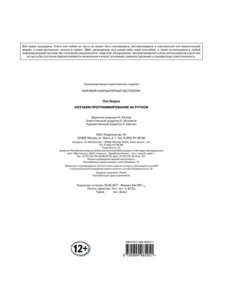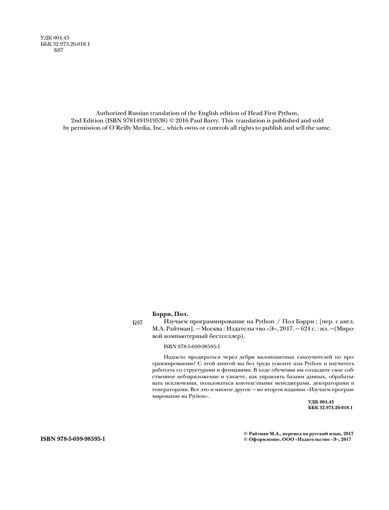 Изучаем программирование на PythonВ данный момент этот товар отсутствует в продаже. Возможно, у нас найдется аналогичный или похожий товар здесь. Серия: Мировой компьютерный бестселлер Надоело продираться через дебри малопонятных самоучителей по программированию? С этой книгой вы без труда усвоите азы Python и научитесь работать со структурами и функциями. В ходе обучения вы создадите свое собственное веб-приложение и узнаете, как управлять базами данных, обрабатывать исключения, пользоваться контекстными менеджерами, декораторами и генераторами. Все это и многое другое — во втором издании «Изучаем программирование на Python». |