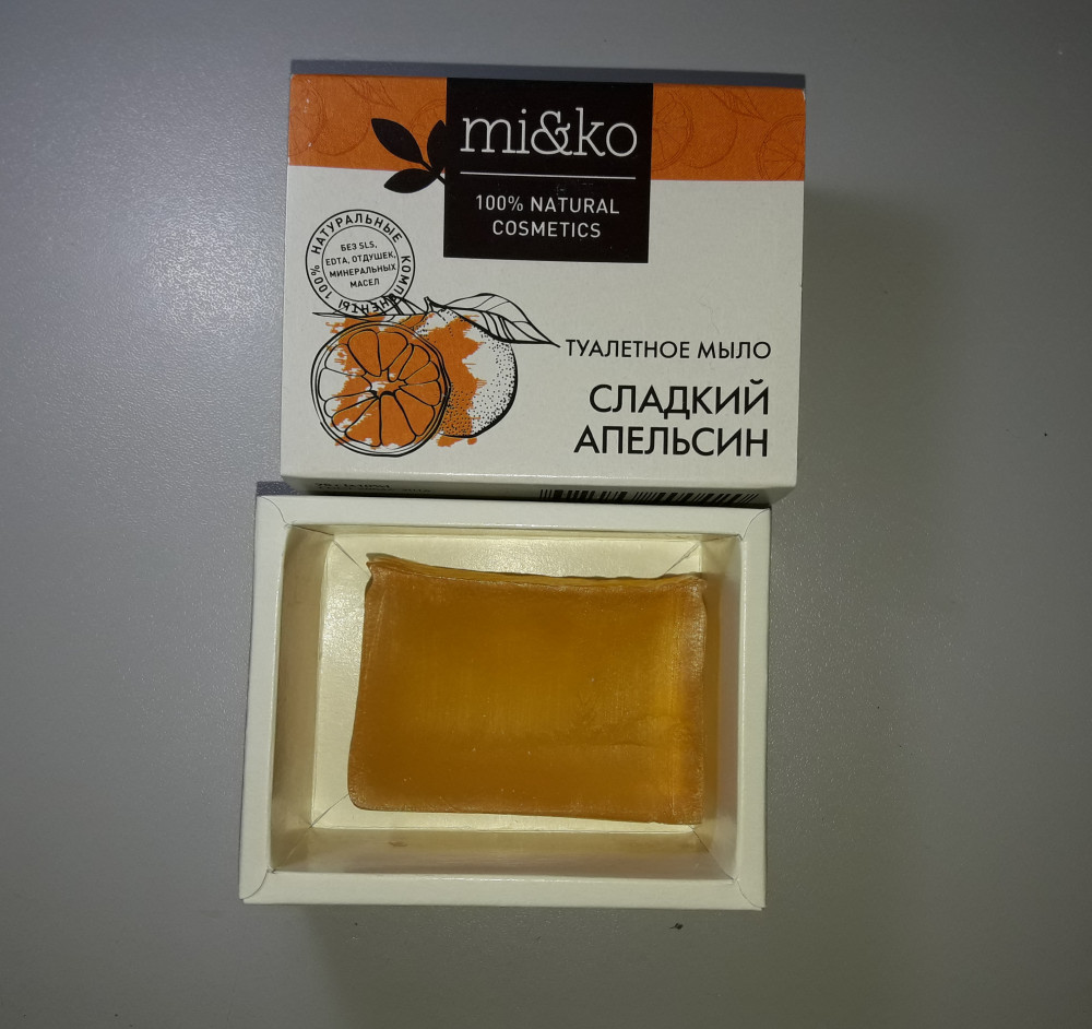 Мыло не совсем понравилось, не соответствует картинке товара. Мыло маленького размера за свою цену. Запах похож на апельсин, но больше химичный. У нас "сладкий апельсин". Остальных понравившихся видов в наличии не было. Коробочка немного заляпана, выглядит не презентабельно. Брали в подарок, может в деле оно хорошее, но такое мыло подарить так и не смогли.. Ожидали, что мыло будет такого же благородного буро-жёлтого цвета с разводами, как на фото. На самом деле простенькое мыло прозрачного жёлтого цвета. В толщину кусочек 2,5 см.