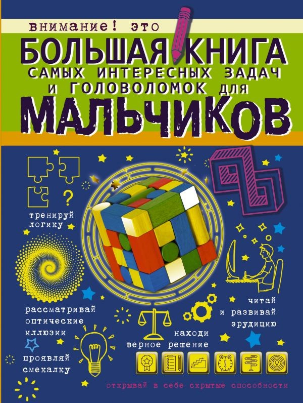 Большая книга самых интересных задач и головоломокВ данный момент этот товар отсутствует в продаже. Возможно, у нас найдется аналогичный или похожий товар здесь. Серия: Большая книга для мальчиков Можешь ли ты представить, что задачки могут быть веселыми, игры с цифрами и буквами весьма занимательными, а рисунки, которые на первый взгляд кажутся простыми, на самом деле скрывают множество загадок? Думаешь, это невозможно? Тогда предлагаем тебе открыть книгу, которую ты держишь в руках, и убедиться в обратном. Ведь в ней собраны только самые загадочные рисунки, интересные головоломки, оптические иллюзии, которые поначалу просто невозможно объяснить, и хитрые задачи, для решения которых тебе нужно подключить свое воображение и нестандартное мышление, проявить сообразительность и находчивость. Уверены, они не оставят тебя равнодушным. Решая их, ты сможешь развить умение быстро и точно считать, строить логические цепочки, находить закономерности, размышлять и делать выводы. Не упусти возможность потренировать свой ум!Для среднего школьного возраста. |