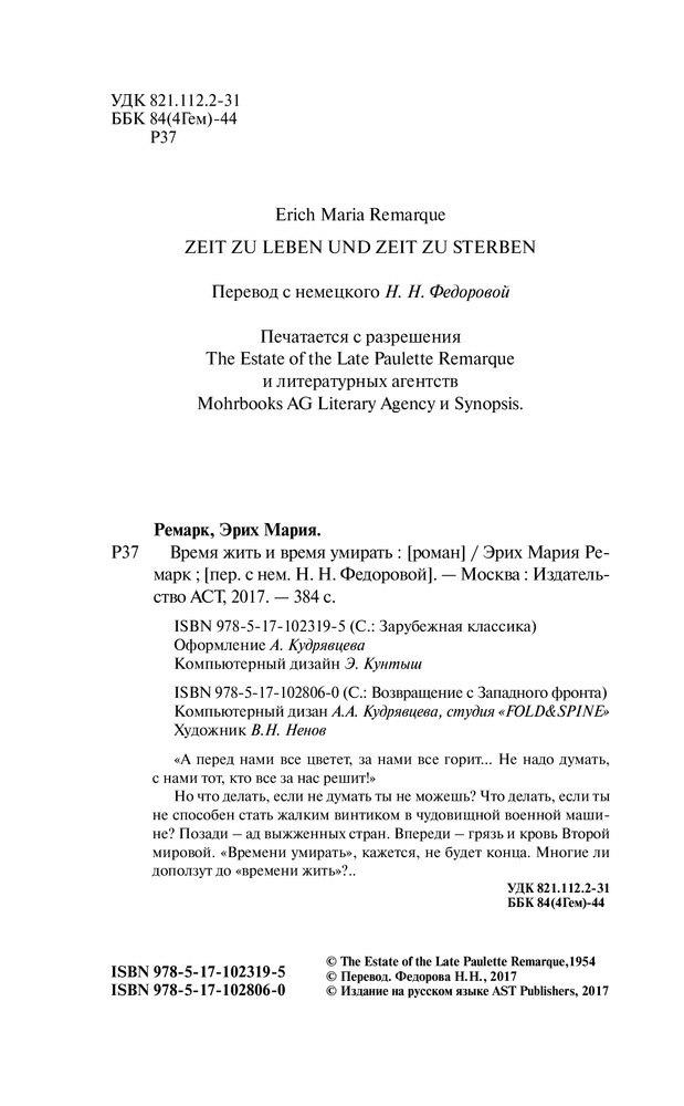 Время жить и время умиратьВ данный момент этот товар отсутствует в продаже. Возможно, у нас найдется аналогичный или похожий товар здесь. Серия: Зарубежная классика «А перед нами все цветет, за нами все горит...Не надо думать, с нами тот, кто все за нас решит!» Но — что делать, если не думать ты не можешь? Что делать, если ты не способен стать жалким винтиком в чудовищной военной машине? Позади — ад выжженных стран. Впереди — грязь и кровь Второй мировой. «Времени умирать», кажется, не будет конца. Многие ли доползут до «времени жить»?.. |