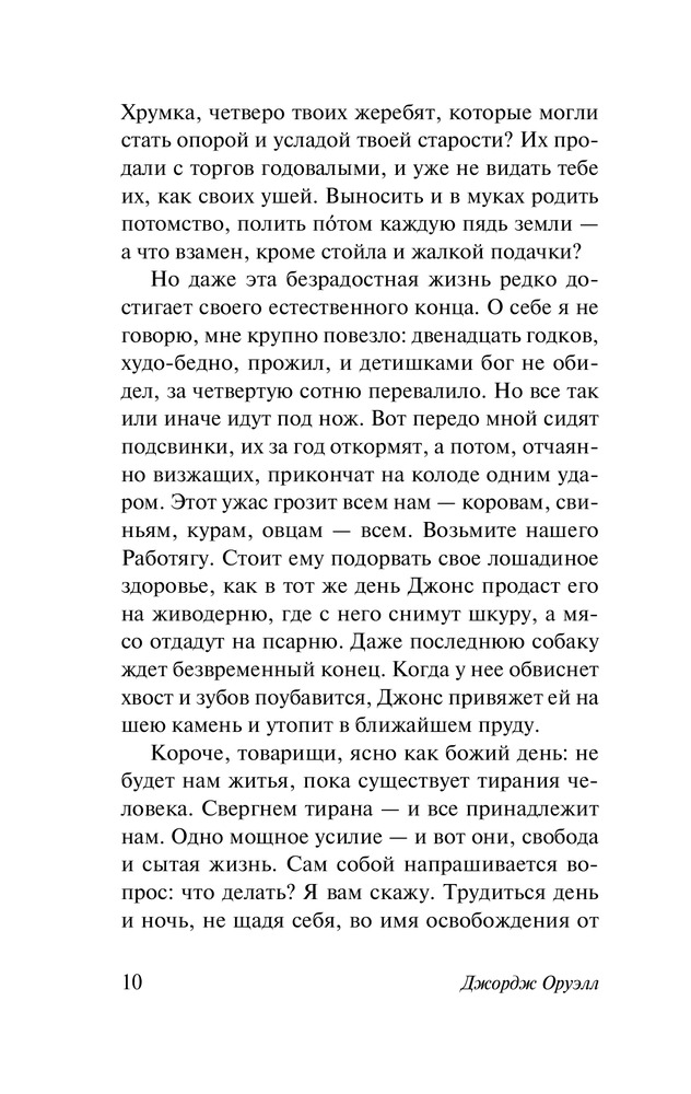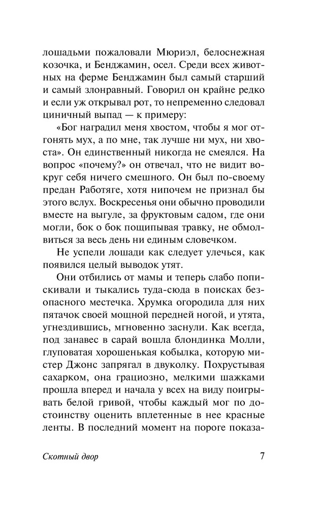 Великолепнейшая обложка, отличное исполнение и обеспеченное удобство чтения. А если характеризовать книгу, то она выше всяких похвал. Основа этой книги, "Скотный двор", после прочтения даёт огромнейшую пищу для размышлений, ибо автор представляет персонажей с очень интересных ракурсов, с которыми ты не можешь не согласиться, но в это же время горишь желанием поспорить. 10/10!