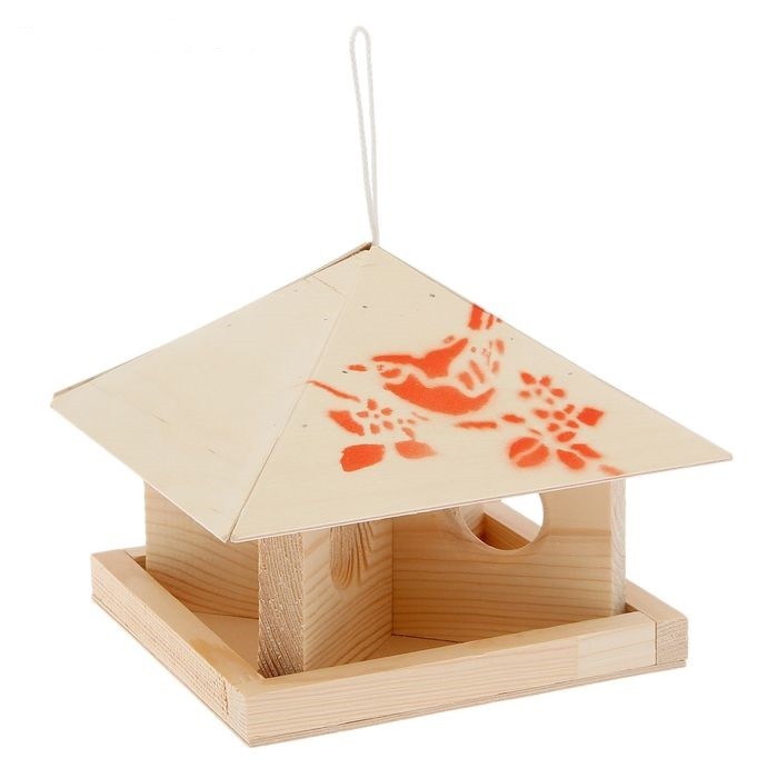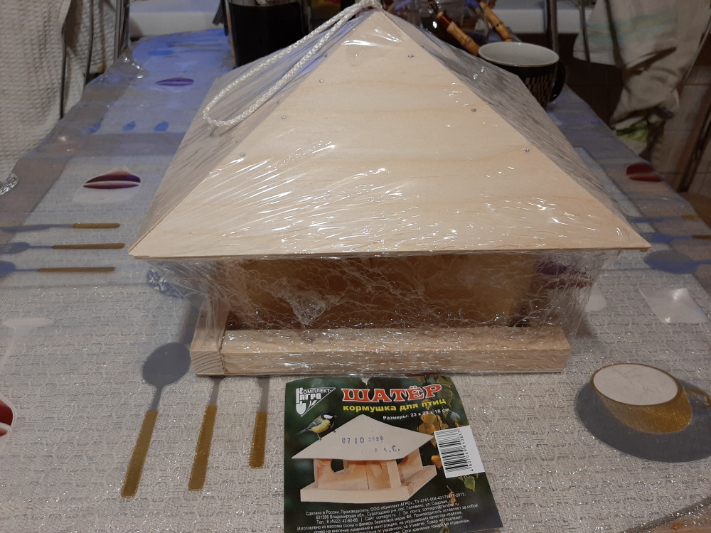 Кормушка неплохая. Но нет на крыше рисунка. Не покрыта олифой, лаком и т.д. Т.е. нужно будет красить самим. Т.к. под дождём и снегом быстро фанера расслоиться.