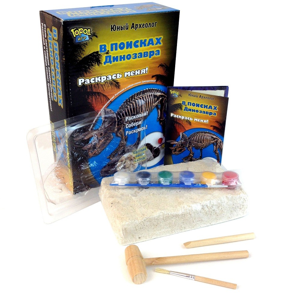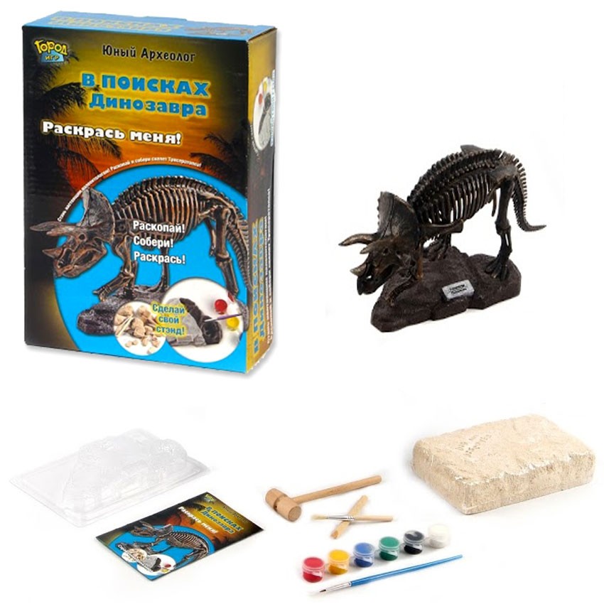 входящих в комплект. Далее мальчикам будет предложено удалит остатки гипса с костей динозавра, используя специальную кисточку. Затем из остатков гипса и специальной массы нужно создать стенд, используя выкопанные кости динозавра. Когда стенд будет готов, ребенок с помощью красок, содержащихся в наборе, сможет раскрасить своего динозавра.