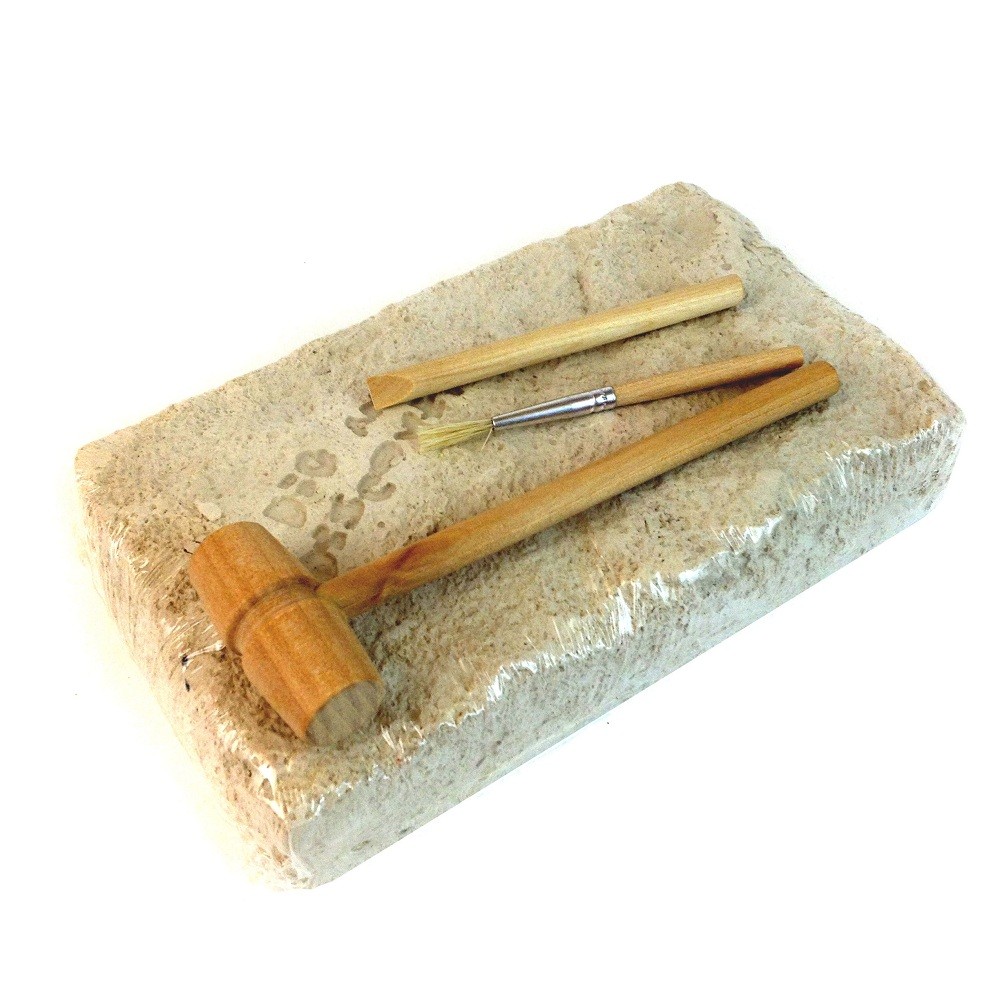 Набор включает в себя гипсовый брусок со скелетом динозавра, который ребенку предстоит выкопать с помощью инструментов, также