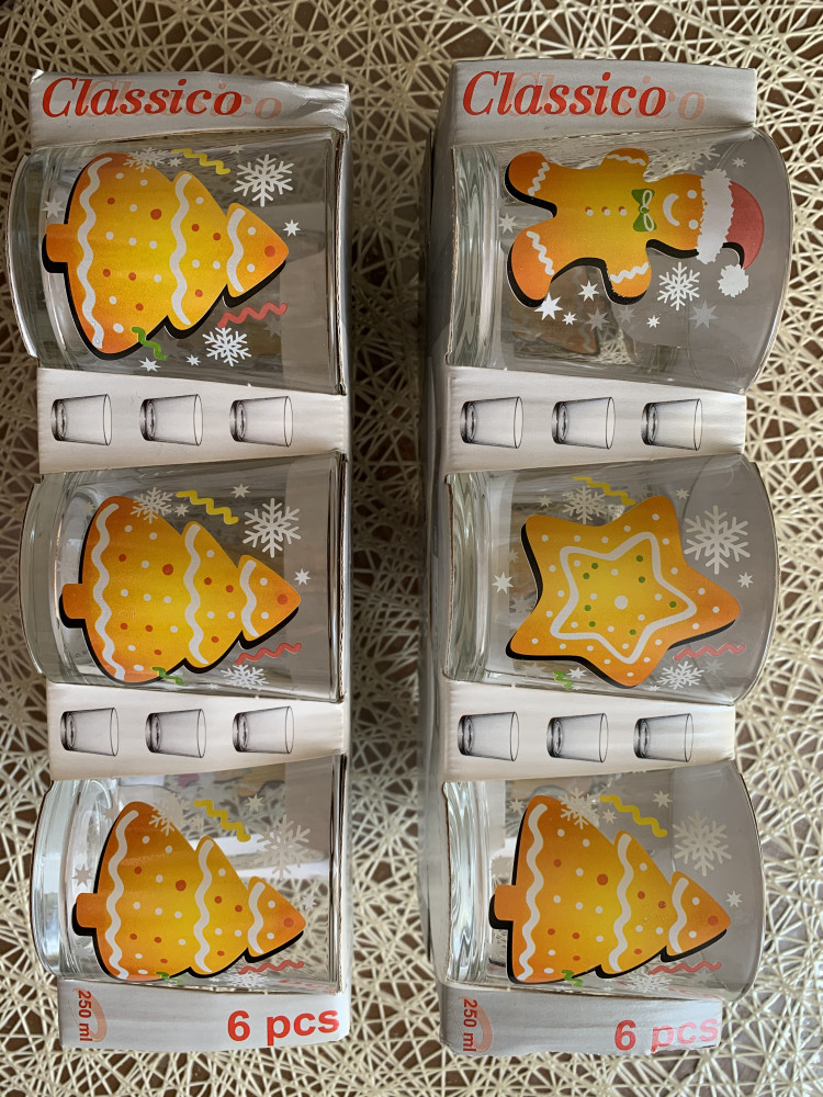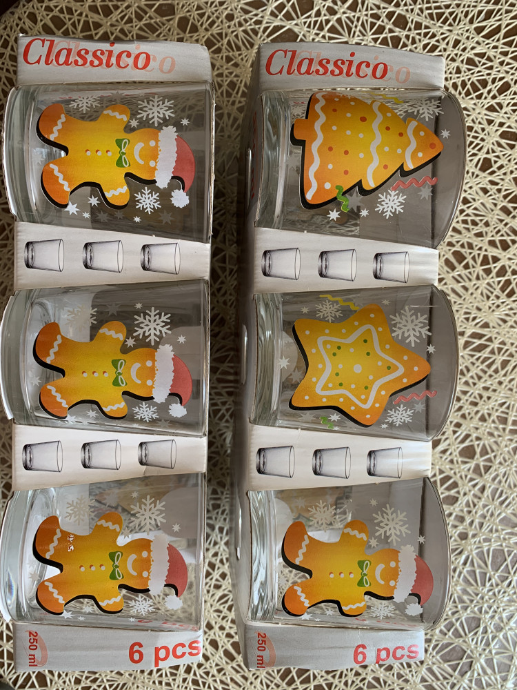 Милые, новогодние стаканчики. Фото на сайте нечеткое к сожалению, в реальности красивенькие, ни чего лишнего. Рисунок с одной стороны. Я заказывала 2 набора, один пришёл как на фото товара - пряничный человечек, пряник, елка, а во втором наборе - три стакана с рисунком елка, и три стакана с рисунком пряничного человечка. Мне не критично. Фото ниже. Стекло прочное, в коробках. Все доставили целым и хорошо упакованным. Огромное спасибо, я довольна 😊
