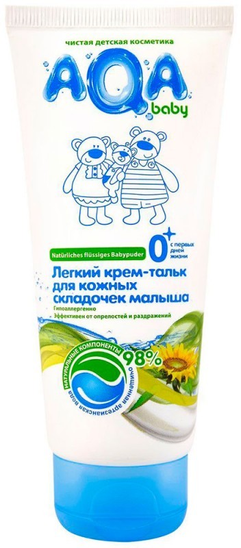 AQA Baby Крем-тальк для кожных складочек малышаВ данный момент этот товар отсутствует в продаже. Возможно, у нас найдется аналогичный или похожий товар здесь. Крем-тальк разработан специально для защиты кожи вашего ребенка в особо нежных местах, там, где наиболее часто возникают покраснения и раздражения (шея, ножки, ягодицы, подмышечные впадины и т.д.). Входящая в состав растительная пудра (натуральный крахмал тапиоки) - мягко впитывает излишнюю влагу и усиливает естественную защиту кожи. Натуральное масло подсолнечника смягчает, увлажняет и питает нежную детскую кожу. |