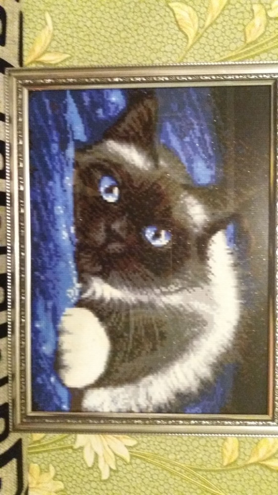 Собрали Кошечку быстро. Смотрится картина шикарно. Страз достаточно, остались запасные. Порадовал стилус, очень удобный для квадратных элементов, пинцетом пробовали собирать - намного сложнее подгонять стразики по клеточкам рисунка. Работа в удовольствие! Схема четкая, всё понятно. Спасибо производителю и Flip!