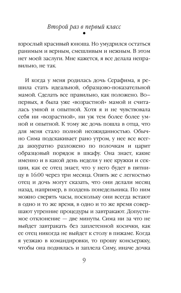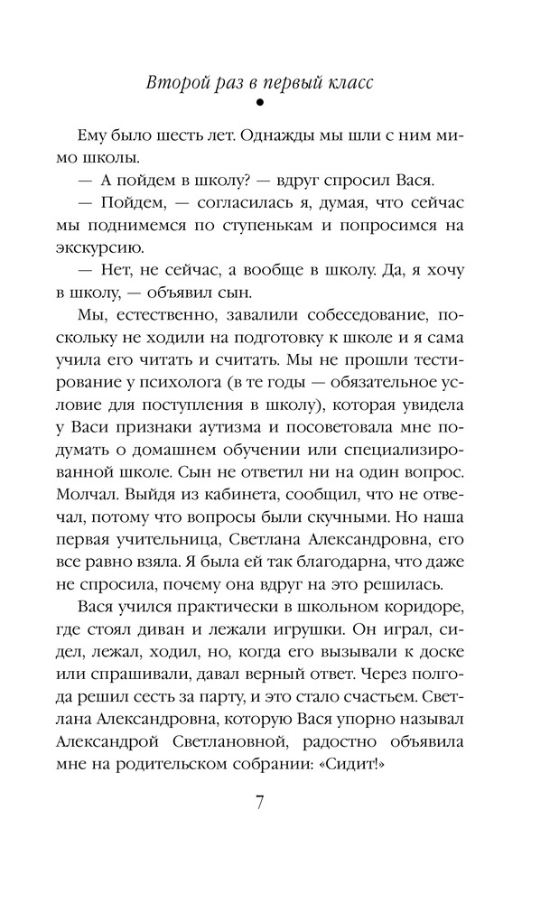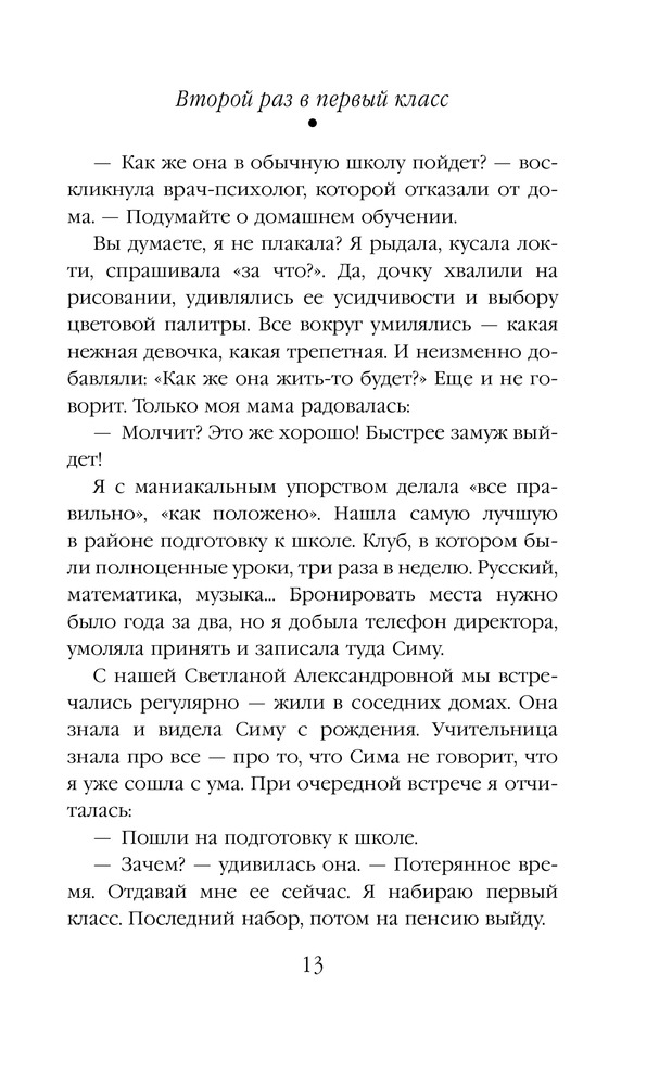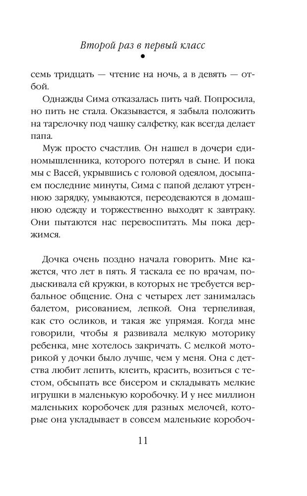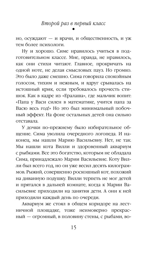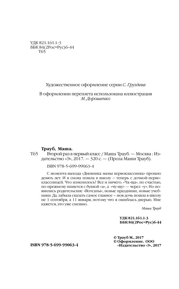 Второй раз в первый классВ данный момент этот товар отсутствует в продаже. Возможно, у нас найдется аналогичный или похожий товар здесь. Серия: Проза Маши Трауб (новое художественное оформление) С момента выхода «Дневника мамы первоклассника» прошло девять лет. И я снова пошла в школу — теперь с дочкой-первоклассницей. Что изменилось? Все и ничего. «Ча-ща», по счастью, по-прежнему пишется с буквой «а», а «чу-щу» — через «у». Но появились родительские «Вотсапы», новые праздники, новые учебники. Да, забыла сказать самое главное — моя дочь пошла в школу не 1 сентября, а 11 января, потому что я ошиблась дверью. Мне кажется, это уже смешно.Маша Трауб |