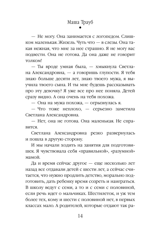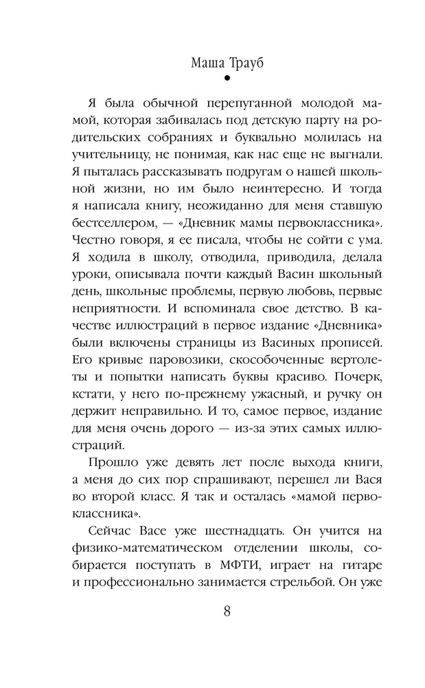 Очень советую бабушкам, мамам и состоявшихся, и будущих первоклассников. Читая Машу Трауб невозможно отделаться от мысли: "Это же про нас!". Открыла для себя этого автора, прочитав "Дневник мамы первоклассника". Читайте - не пожалеете.